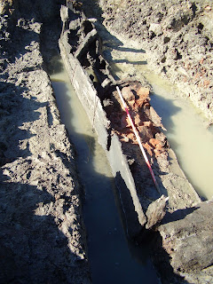 Water seeping up through the trench. So far we have only removed rubble layers tipped in the 1960s.We have decided to postpone the work for another week in the hope that the river levels fall further. At present there is no point pumping out the excavation as it would re-flood very quickly.